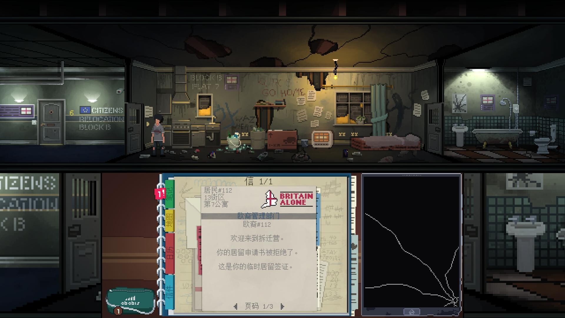 他首先是被赶到了外国人聚集的贫民窟,还要遭受非人的待遇,故事里主角可以通过打工来赚钱,不过需要注意自己的健康值和信用分,信用分过低会被赶出英国gameover,健康值降到0会死翘翘。要达成完美结局需要注意在前面的分支剧情帮助他人从而最后审判获得正面的评价,帮助抵抗组织可以获得最后一个成就。结局大致就是新政党下台,伦敦大墙被拆掉,英国又恢复了往日的风采。