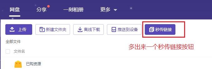 这个时候,360浏览器就可以用百度网盘通过秒传链接来下载东西了。打开你的百度网盘,刷新一下页面,多出了一个按钮【秒传链接】,如下图所示: