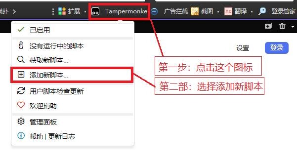 2. 下载完后,解压文件,选中【Tampermdata-filter_v4.9】文件,点击右键,选择打开方式–>360浏览器,等待约1秒左右的时间,360浏览器会提示你【要添加”Tampermdata-filter”吗】,点击【添加】按钮,添加之后,360浏览器的扩展栏目会添加一个黑色的小图标,点击图标,选择【添加新脚本】,如下图所示: