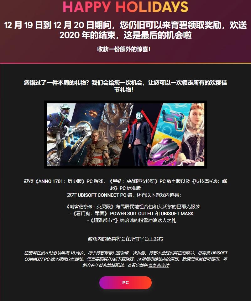 【游戏资讯】免费领取《ANNO 1701:历史版》《星链:决战阿特拉斯》《特技摩托®:崛起》等三款游戏 动漫资讯 4年前 ☆夕落づ - 育碧老慈善家了。 获取地址:https://register.ubisoft.com/happyholidays2020-lastchance/zh-CN 截止时间:2020 年 12 月 21 日 21 时