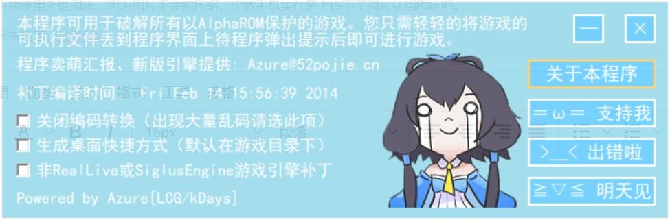 【破解工具】日本windows检测突破程序 技术教程 5年前 Ling240 - 9 有的日本的galgame会对电脑的windows序列号进行检测来判定你的地区,如果你的windows不是日本的游戏会自动跳出/闪退/黑屏等(也就是所谓的Alpha保护)。本软件就是为了解决这一限制而诞生的。 最后审核由 龙姐 UID:1 程序使用方法简单,直接将进不去的游戏的exe文件拖进程序画面即可。
