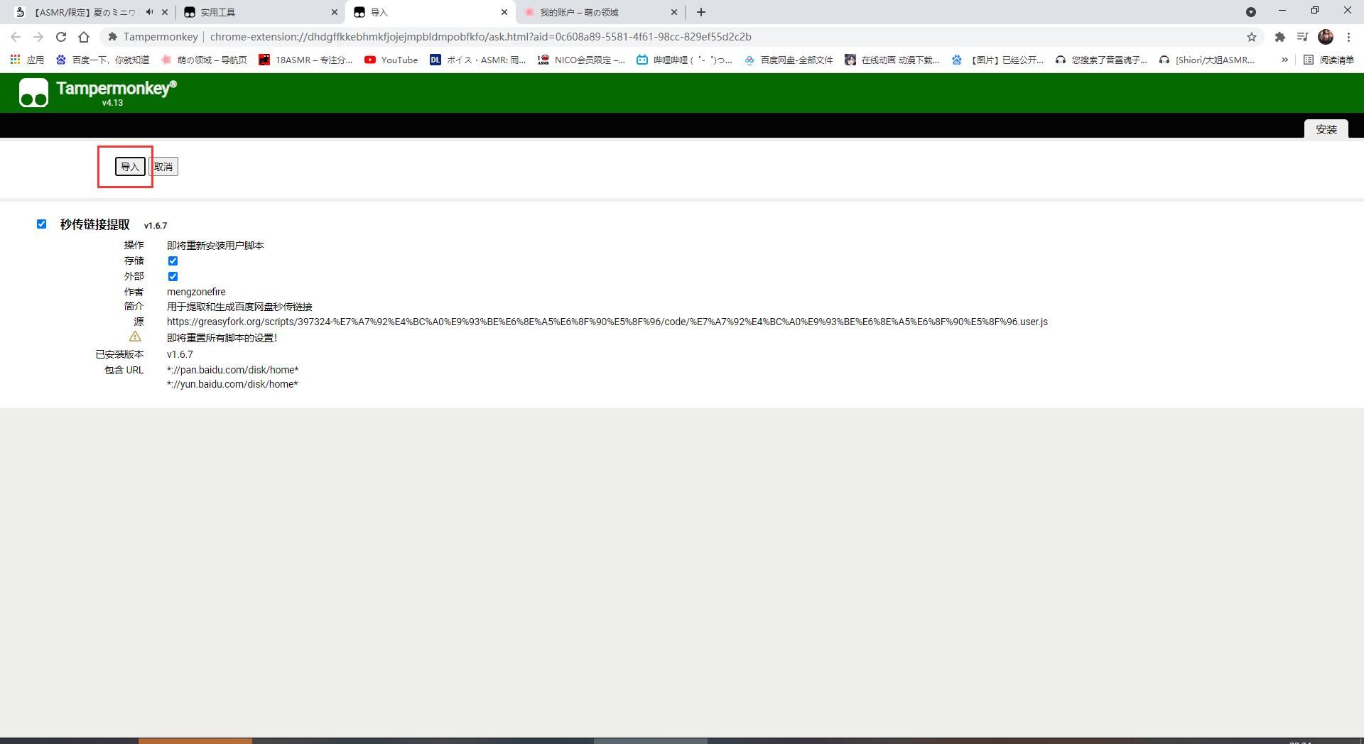 4. 点击 导入 ..这样脚本就会安装进你的油猴脚本内了..妙传链接就安装好了