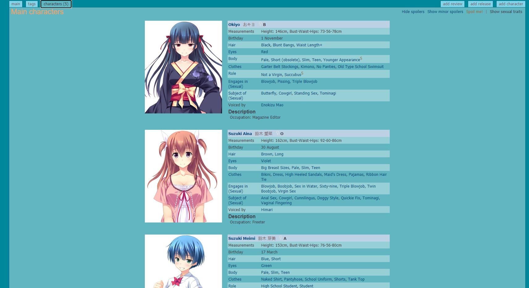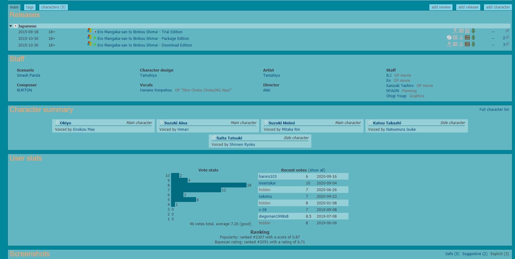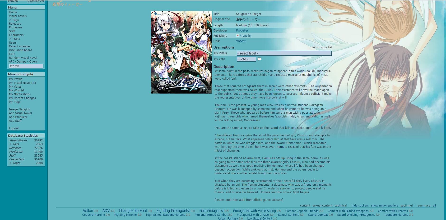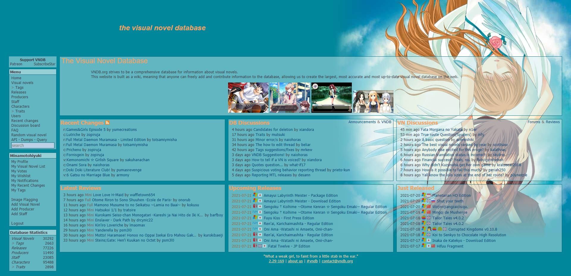 【网站推荐】The Visual Novel Database(英文黄油维基站) 技术教程 4年前 绯雪Hiyuki - 1 一个英文的Visual Novel维基站,全称The Visual Novel Database,简称vndb。 最后审核由 龙姐 UID:1 英文的wiki站,截止至2021年7月20日17点51分共有30292个游戏被收录。 2DFan有时候一些冷门的游戏它没有,然后这个网站又不需要翻墙看,所以推个这个。现在义务教育都很普及大家应该都会一点英语,就算不会,你还有谷歌翻译 网址:https://vndb.org