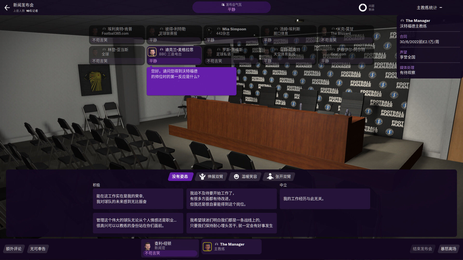 和球员及媒体的互动变得前所未有地真实且极具意义。表情动作让你能表达各种情绪,而快速谈天可改善教练每日生活中皆会遇到的简短又随性的对话。在《足球经理2021》,你的言语将深刻影响着其他人,让他们感受到你身为教练的作风。