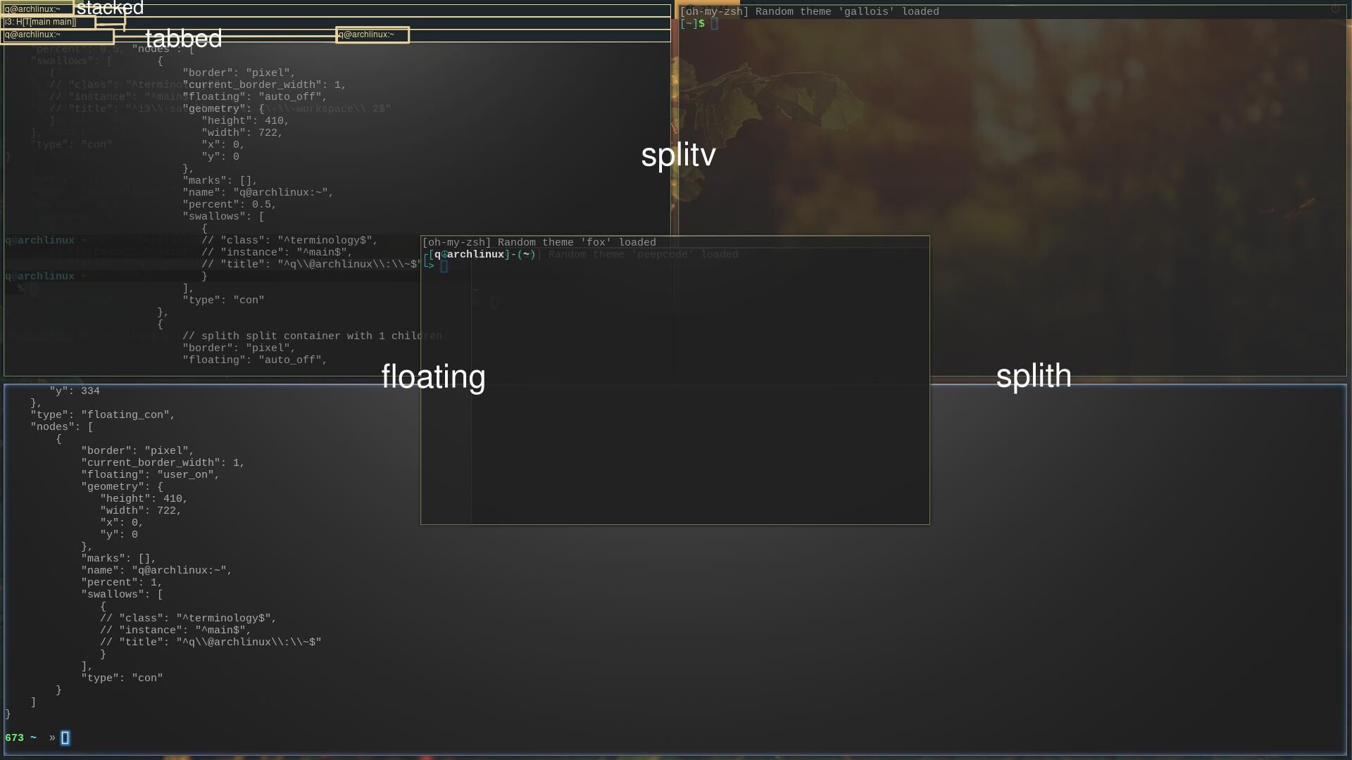 i3一共有6种布局类型 (splith,splitv,tabbed,stacked,floating,unspecifiedo)。