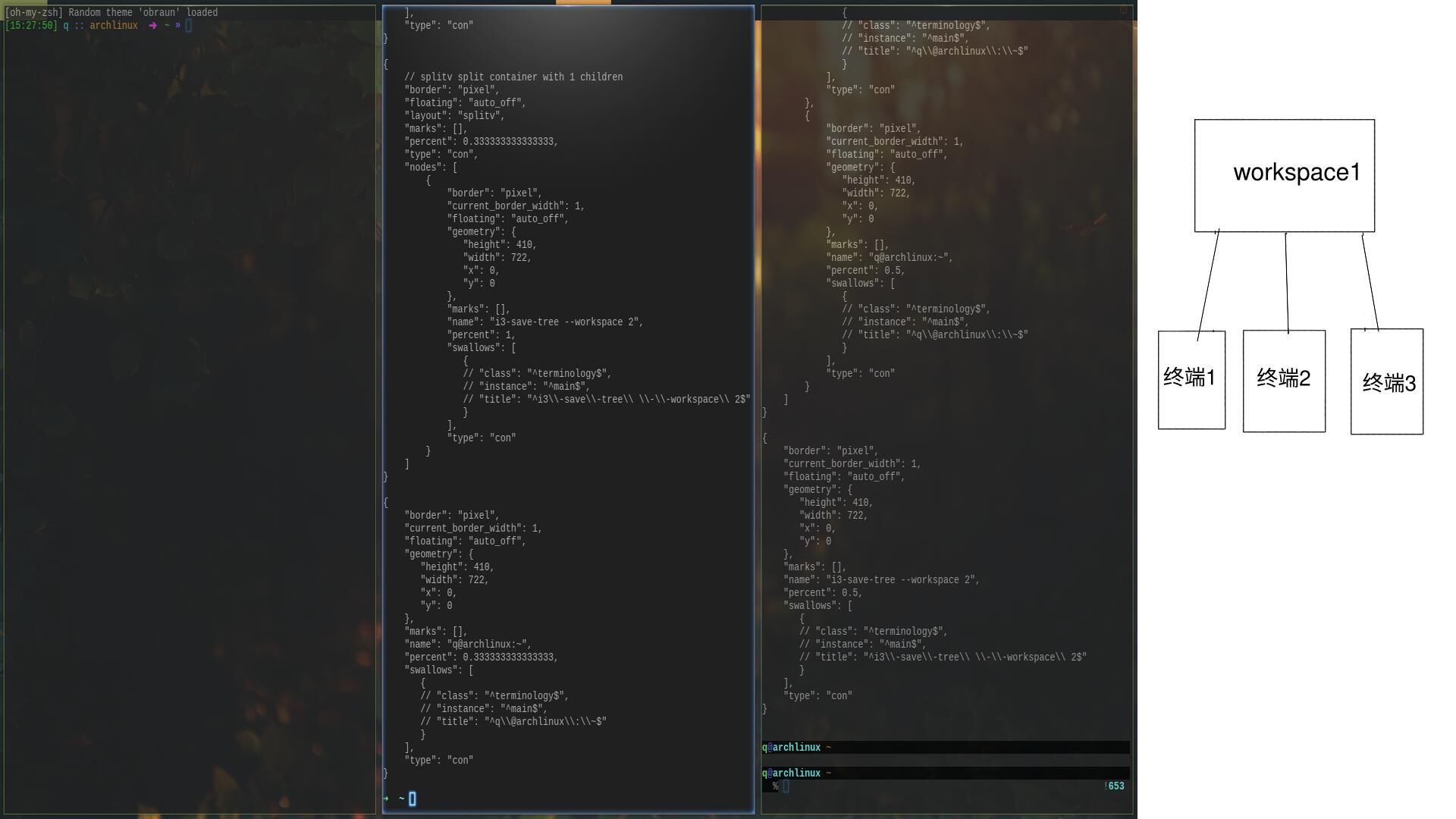 在i3中,窗口被树这种结构组织。举个例子。在workspace1下打开三个终端仿真器。窗口的组织如下