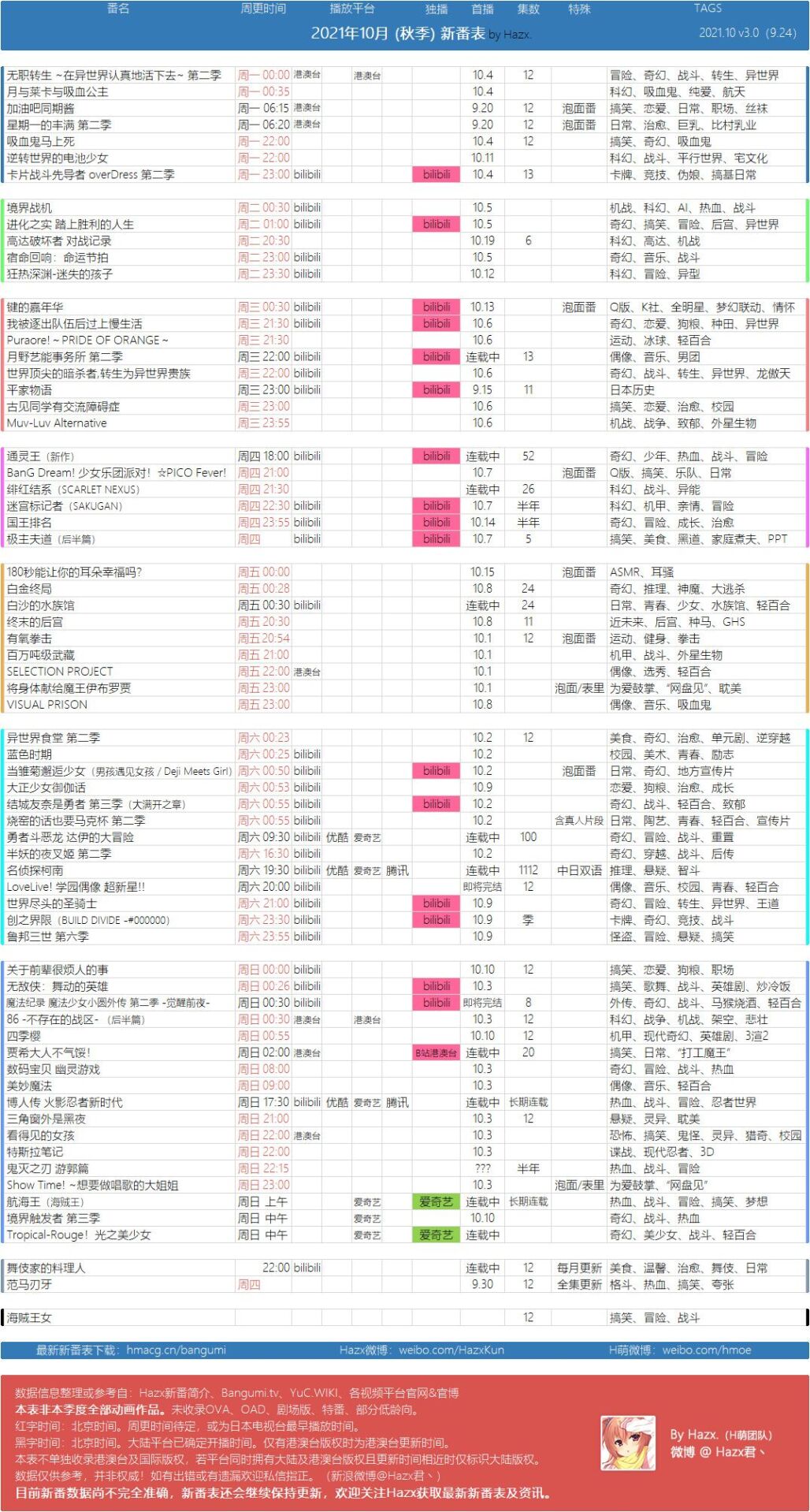【新番速递】2021年10月新番首播时间及播放平台表