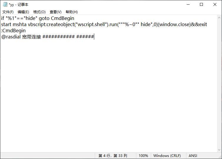 第一步 下载我上传的windows批处理器文件 yy.bat,右键编辑,自行修改宽带账号密码