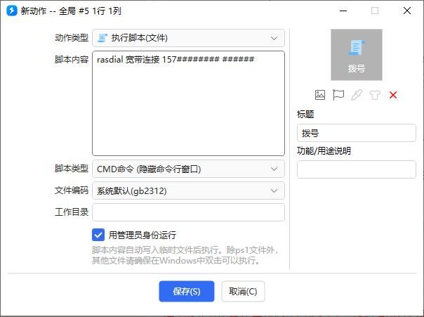 脚本类型为CMD隐藏命令行窗口,否则会弹出CMD指令运行窗口,文件编码选择系统默认(gb2312),勾选管理员身份运行,保存即可