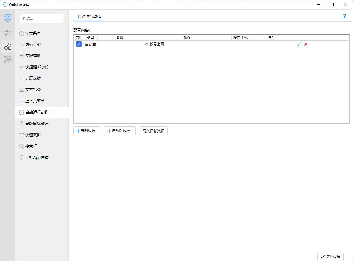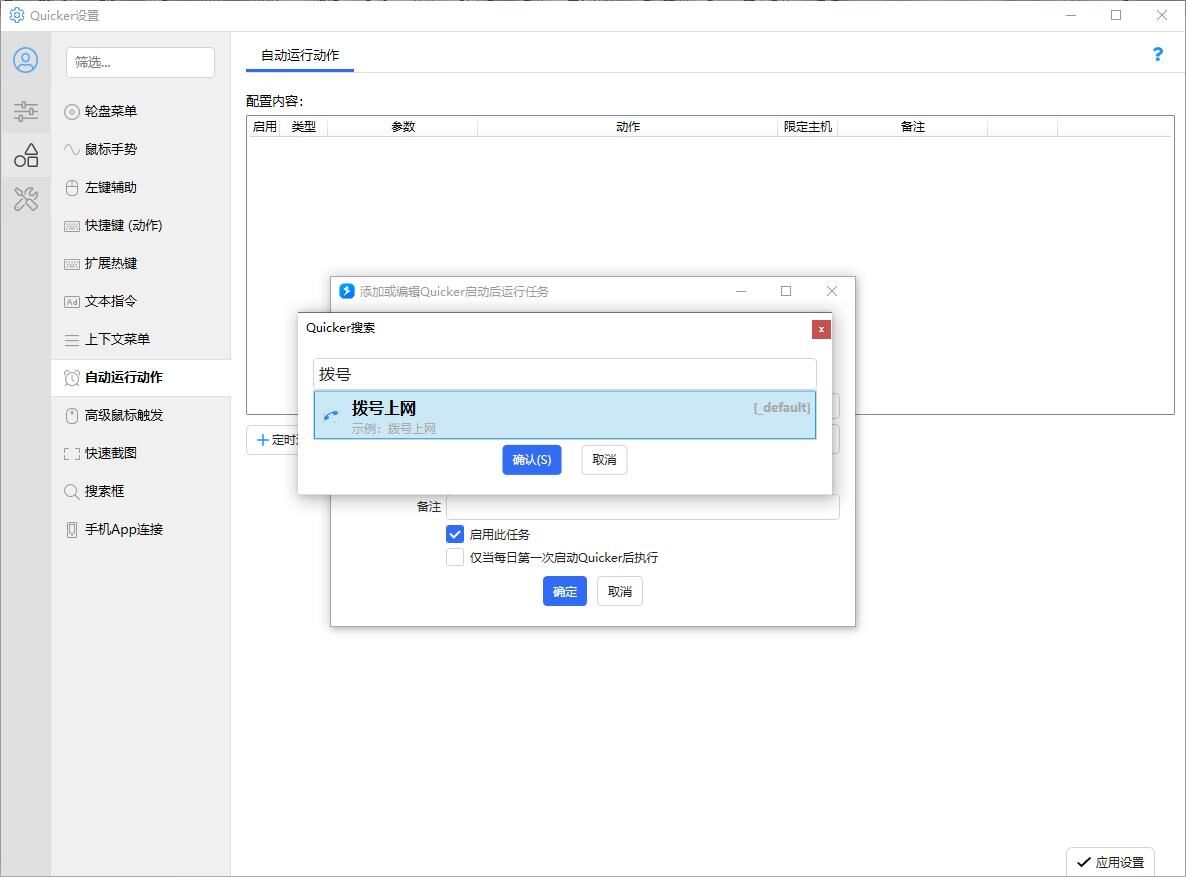 第三步 已经订阅了专业版的宝儿,可以打开软件设置窗口,选择辅助功能里的自动运行动作,添加“启动后运行动作”,搜索你刚才添加的动作名称,勾选启用,就可以看到动作已经添加。开机后系统会自动启动quicker软件,在quicker软件启动的第一时间,quicker会自动启动这个拨号动作