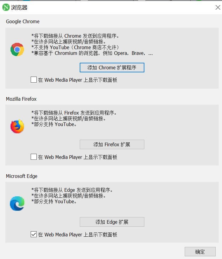 - 可以添加浏览器扩展,接管嗅探下载网页上的视频/音频文件。