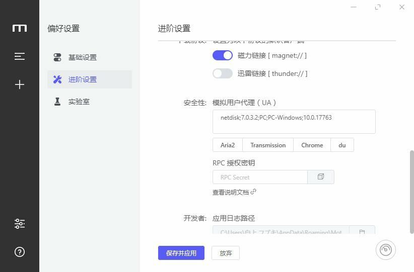 - 将脚本提供的UA导入下载器中(设置-进阶设置-模拟用户代理UA-保存并应用)