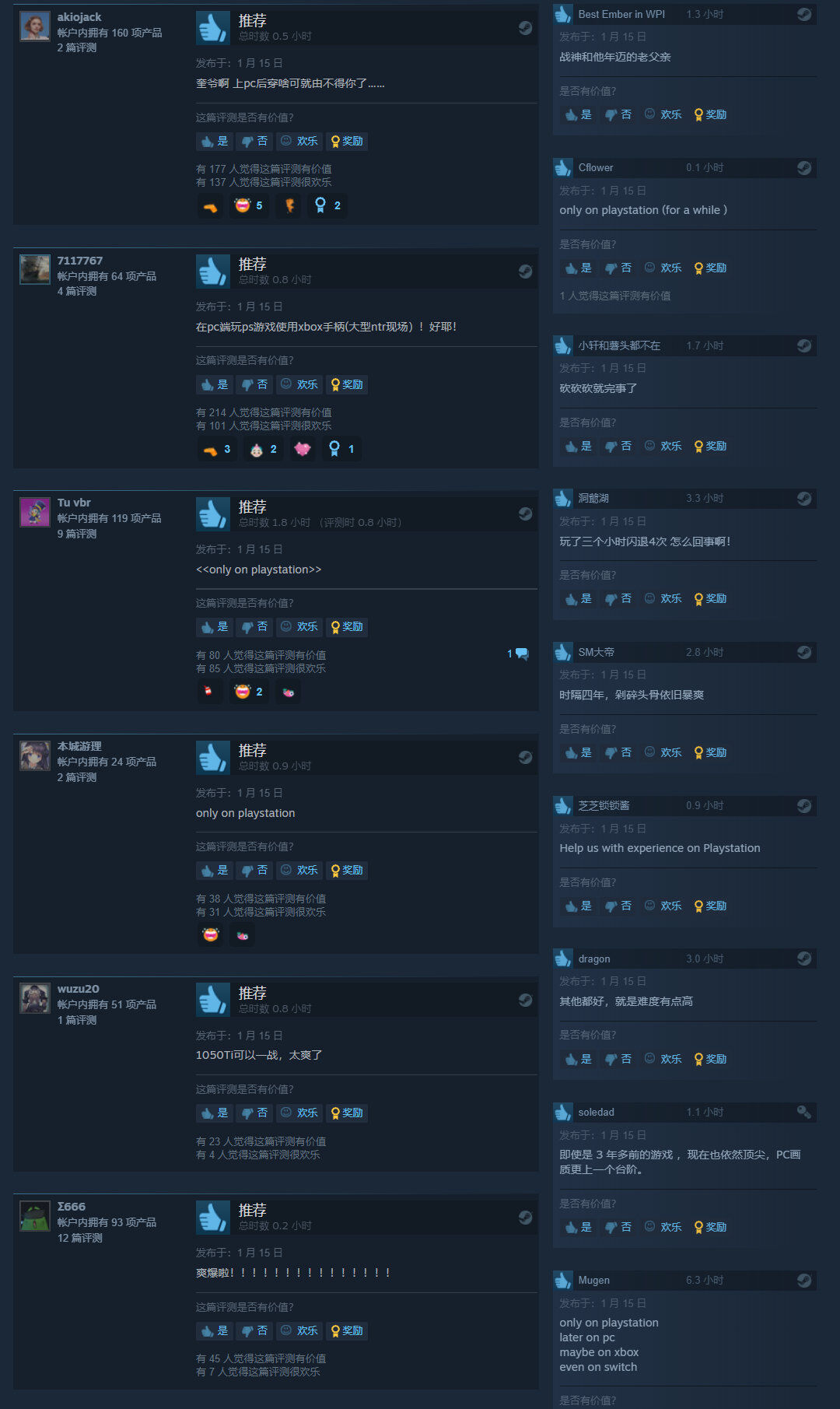 从评测中能看出,索尼对这款神作的移植工作非常用心,专门为PC版做足了适配,效果拔群,1050ti也能畅玩。因此尽管仍有玩家吐槽“only on playstation”的事,但他们也基本都给出了好评。