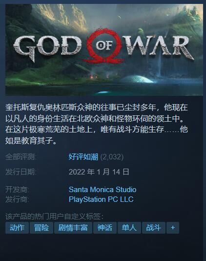 原PS4独占游戏《战神4》今日已正式登陆PC平台,目前Steam上已有2000多名玩家为它写评测,好评率96%、“好评如潮”!
