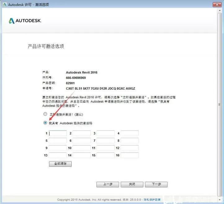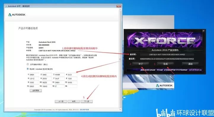 14. 将申请号复制粘贴(Ctrl+c,Ctrl+v)至请求码框中,点击补丁,点击生成,将激活码复制粘贴(Ctrl+c,Ctrl+v)至左边小框内,点击下一步。
