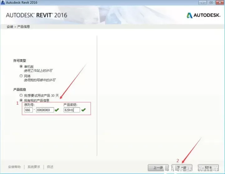 5. 输入序列号:666-69696969 产品密匙:829H1 点击下一步。
