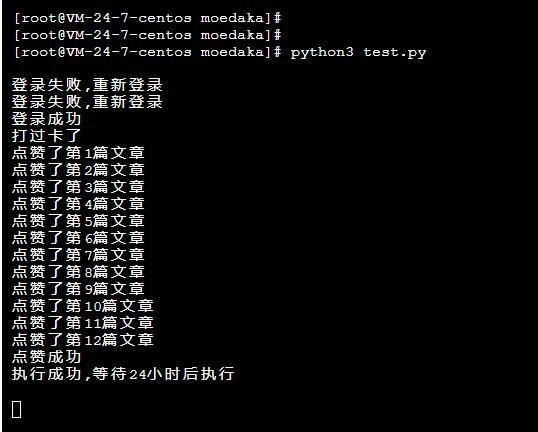 #需要的库from selenium import webdriverfrom selenium.webdriver.common.by import Byfrom selenium.webdriver.chrome.options import Optionsfrom aip import AipOcrimport time#百度api文字识别的应用码,自己注册账号填入,详情见预备知识3APP_ID = '你的appid'API_KEY = '你的apikey'SECRET_KEY = '你的secretkey'client = AipOcr(APP_ID, API_KEY, SECRET_KEY)username='你的账号(邮箱)'password='你的密码'#对浏览器的配置项,我也是网上抄的,主要是为了无界面运行且不崩溃opt = Options()opt.add_argument('--no-sandbox')opt.add_argument('window-size=1920x1080')opt.add_argument('--disable-gpu')opt.add_argument('--hide-scrollbars')opt.add_argument('--headless')#登录部分def m_login(): global driver #下面前两项driver是用微软Edge控制的,第三项是chrome浏览器控制的, #要么注释掉前两项,要么注释掉第三项,具体看你用的是什么浏览器 #忘了说,不管哪个都还需要其对应的浏览器驱动, #不是只装浏览器就行,详情看预备知识3 driver = webdriver.Edge() driver.maximize_window() #driver = Chrome(options=opt) #没什么技术含量,就模拟真人点击 driver.get("https://www.moezone.me/")#访问首页 driver.find_element(By.XPATH,'/html/body/div[12]/div/div[2]/div/footer/a[1]').click()#点欢迎信息 driver.find_element(By.XPATH,'/html/body/div[5]/div[2]/div/div[3]/div[1]/a').click()#点登录 driver.find_element(By.NAME,'email').send_keys(username)#输入账号 time.sleep(1)#防止过快出错,等一会,下面的sleep函数都是这个意思 driver.find_element(By.NAME,'pwd').send_keys(password)#输入密码 time.sleep(1) img=driver.find_element(By.XPATH,'/html/body/div[12]/div/div[2]/div/form/div/div/div/div[4]/div/div[2]/img')#找到验证码 img.screenshot('001.png')#保存验证码 f=open('001.png','rb')#打开验证码 imgdata=f.read()#读取验证码的二进制信息 yzm=client.basicGeneral(imgdata)#发验证码给百度并返回信息 f.close()#关闭打开的图片 yzm=yzm['words_result'][0]['words']#提取出4位数字 time.sleep(1) driver.find_element(By.NAME,'captcha').send_keys(yzm)#输入验证码 time.sleep(1) driver.find_element(By.XPATH,'/html/body/div[12]/div/div[2]/div/form/footer/button').click()#点欢迎信息 time.sleep(3) driver.find_element(By.XPATH,'/html/body/div[12]/div/div[2]/div/header/div/a').click()#忘了点啥了 driver.find_element(By.XPATH,'/html/body/div[5]/div[2]/div/nav/ul/li[1]').click()#点一次首页#验证码识别很有可能出错,对登录进行异常处理def m_tlogin(): try: m_login() print("登录成功") return False#成功返回False except: driver.close()#出错后关闭浏览器 print('登录失败,重新登录') return True#然后返回Truedef m_daka(): driver.find_element(By.XPATH,'/html/body/div[5]/div[2]/div/div[3]/div[2]').click()#点签到 time.sleep(3) driver.find_element(By.XPATH,'/html/body/div[12]/div/div[2]/div/footer').click()#点提示信息#打过卡了再打会报错,异常处理def m_tdaka(): try: m_daka() print('打卡成功') return False#返回False except: print('打过卡了') return False#还是返回False#进入最新文章页面def enternew(): time.sleep(1) ele=driver.find_element(By.XPATH,'/html/body/div[8]/div[2]/div[2]/div/article[8]/div/a/img')#定位一个元素 driver.execute_script("arguments[0].scrollIntoView();",ele)#滚动到合适位置 time.sleep(1) driver.find_element(By.XPATH,'/html/body/div[8]/div[2]/a').click()#点进最新文章#对文章进行一次点赞def m_dianzan_one(i): time.sleep(1) driver.execute_script('window.scrollBy(0,{})'.format(i*300-300))#滚动找元素 time.sleep(1) xrul='/html/body/div[7]/div[1]/article[{}]/div[2]/a'.format(i)#获取文章的Xpath链接 el=driver.find_element(By.XPATH,xrul).get_attribute('href')#获取文章的url链接 driver.get(el)#打开文章页 time.sleep(1) ele=driver.find_element(By.XPATH,'/html/body/div[7]/div/div[1]/div/a[1]')#准备翻到下面 driver.execute_script("arguments[0].scrollIntoView();",ele)#翻到下面准备点赞 time.sleep(1) js = 'document.getElementsByClassName("inn-singular__post__toolbar__item__link")[0].click();'#不知道为什么用click点不了,用了js点击 driver.execute_script(js)#点击 time.sleep(1) driver.back()#返回文章列表页 print('点赞了第{}篇文章'.format(i)) time.sleep(1)#循环点赞12次,好像12次是上限吧def m_dianzan(): enternew() for i in range(1,13): m_dianzan_one(i) print('点赞成功')#主函数=登录+打卡+点赞def main(): a=True while a: a=m_tlogin() b=True while b: b=m_tdaka() m_dianzan()#循环执行,每24小时1次if __name__=='__main__': while True: main() driver.close() print('执行成功,等待24小时后执行') time.sleep(24*60*60)运行截图