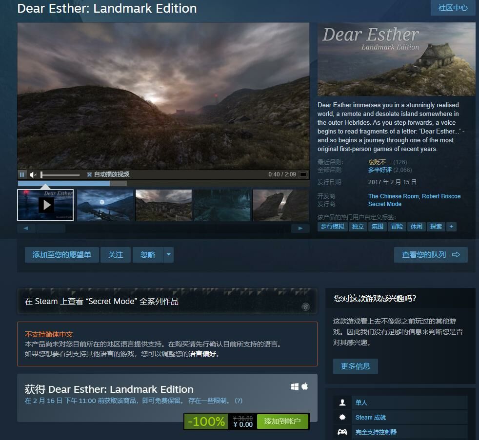 领取地址:https://store.steampowered.com/app/520720/Dear_Esther_Landmark_Edition/