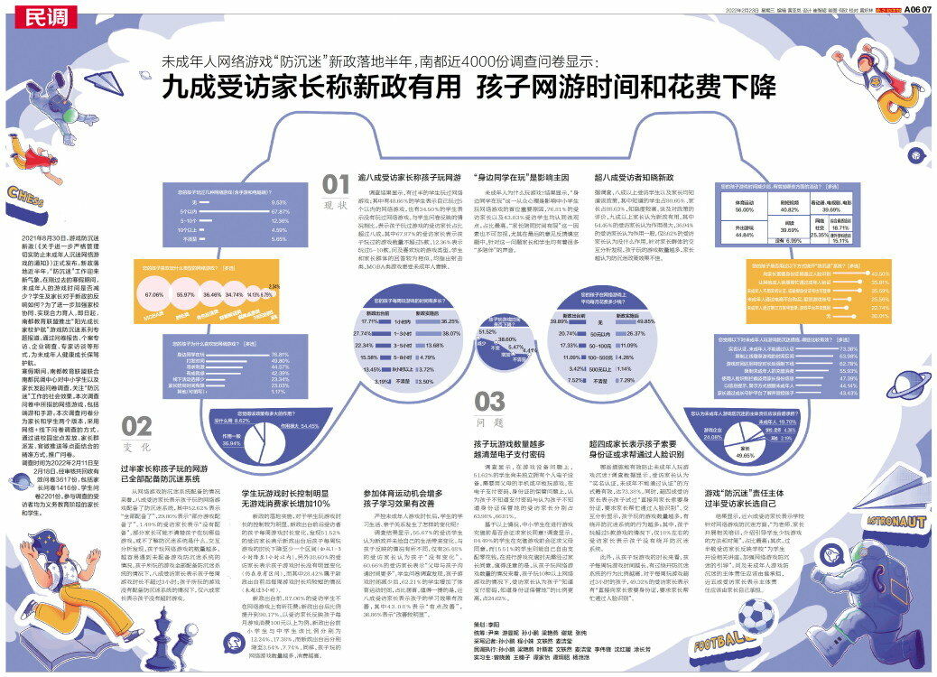 【资讯】九成受访家长称新政有用,孩子网游时间和花费下降 动漫资讯 3年前 无情的审核水文bot - 1 结果都出去乱跑了,好烦的说 最后审核由 龙姐 UID:1 据南方都市报调查,九成受访家长认为未成年人网络游戏防沉迷新政有一定作用,孩子网游时间和花费有所下降。但是孩子玩的游戏数量越多,防沉迷政策效果就越不佳。 调查结果显示,超过八成家长称孩子玩网游,「身边同学在玩」是影响未成年人玩网游的重要原因,最受欢迎的游戏类型是射击和MOBA类。近五成家长认为游戏防沉迷责任主体责任应由自己承担。 家长认为在新政实施之后,未成年人游戏时长显着下降,参加其他活动机会增多,对于学习效果也有改善,但仍存在要求家长帮忙通过防沉迷认证,使用家长账户进行游戏充值等现象。