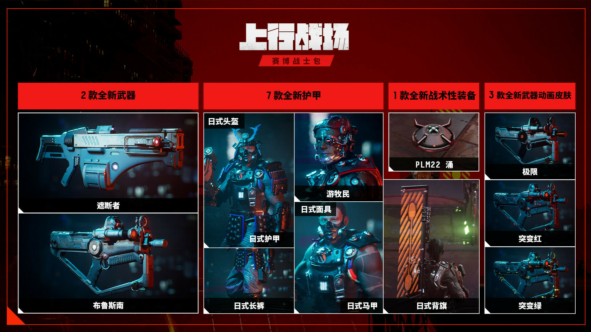 赛博战士包是每位热衷武士元素的《上行战场》玩家的必备武器库!七款极品武士盔甲供你挑选,尽管穿上去震慑你的敌人吧,那气场必须杠杠的。额外的两个新武器和战术性武器更是锦上添花。除此之外,3种新的武器皮肤对你的敌人也相当重要,至少能让他们知道自己是被多么炫酷的武器杀死的。总得给他们留下一些尊严对吧… 《上行战场》赛博战士包现已上线Steam!戳这里查看更多。