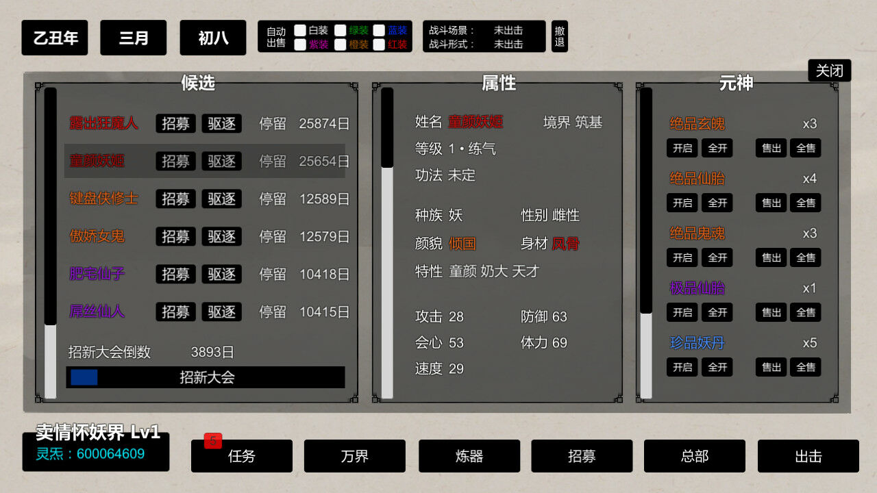 通过程序生成的各式妖艳贱货,在确保 政(数)治(值)正(不)确(崩)的前提下随机出无数潜力不同的各种族角色,极品之上仍有极品,奇葩之中更有奇葩!绝对逼死强迫症!