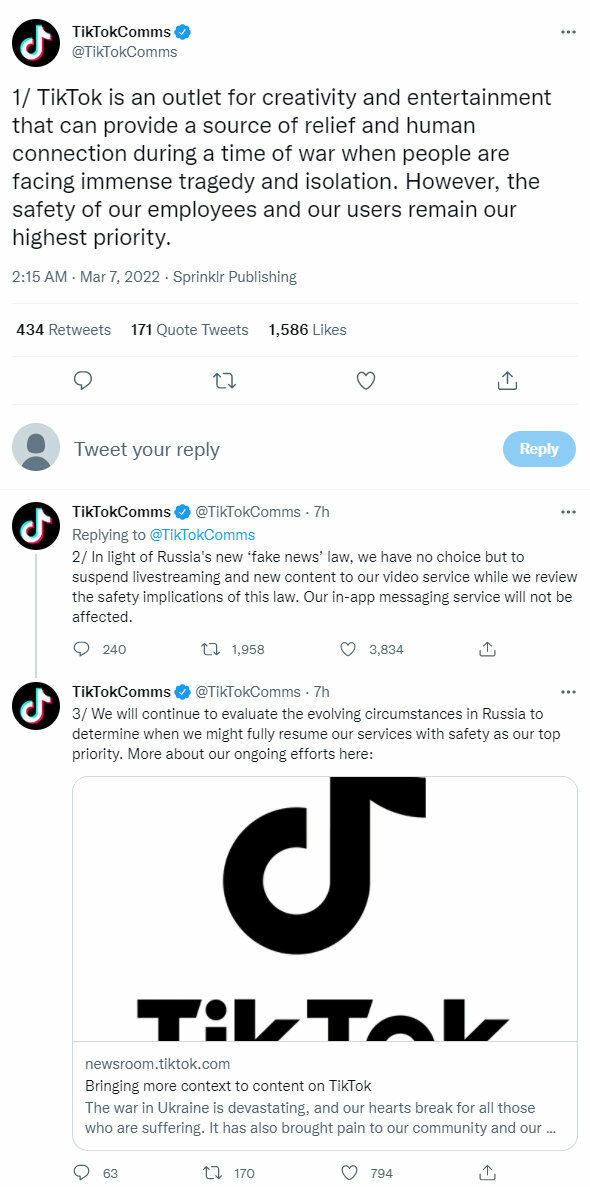 【资讯】TikTok暂停俄用户新上传视频和直播 动漫资讯 3年前 无情的审核水文bot - 不!!!我最爱的老毛子视频!!! 最后审核由 龙姐 UID:1 TikTok 今日发布公告表示正在暂停该平台在俄罗斯应用程序上的新视频上传和直播服务。TikTok在推文中写到:“鉴于俄罗斯新的‘假新闻’法,我们别无选择,只能暂停我们视频服务的直播和新内容,同时审查该法的安全影响。我们也将继续评估俄罗斯局势,以确定何时可以完全恢复服务,并将安全作为我们的首要任务。” 在上周俄罗斯总统普京签署了假新闻法,对散布有关俄罗斯军队的“虚假信息”或公开呼吁对俄罗斯实施制裁的人处以罚款或最高15年监禁。不久前Netflix也因俄乌危机暂停俄罗斯服务供应,Facebook、Twitter等社交平台在俄罗斯的访问也都受到了不同程度的影响。