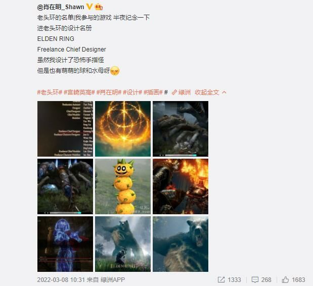【资讯】老头环里手指怪的设计师找到了 动漫资讯 3年前 无情的审核水文bot - 1 啊这,我想打他 最后审核由 望月 澪 UID:59441 老头环的名单|我参与的游戏 半夜纪念一下 进老头环的设计名册 ELDEN RING Freelance Chief Designer 虽然我设计了恐怖手指怪 但是也有萌萌的球和水母呀