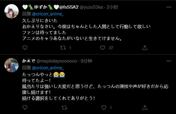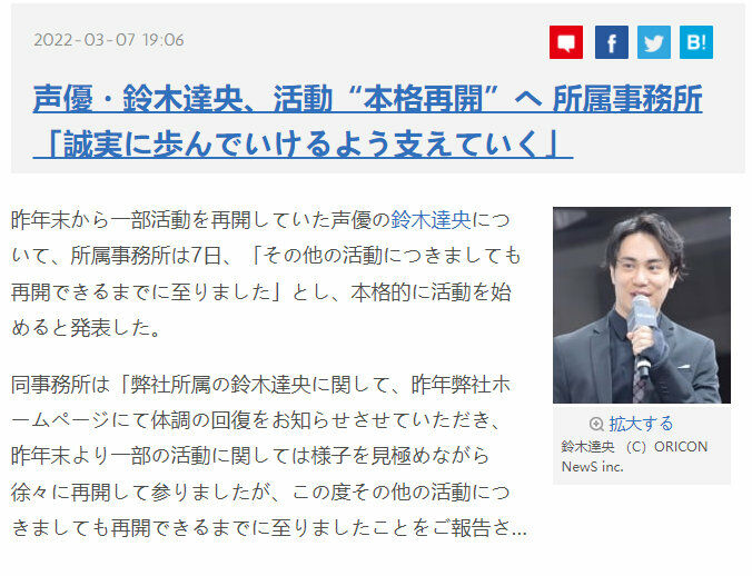 声优铃木达央所属事务所今日发文表示,铃木达央目前已经恢复到可以参加所有活动的状态,今后事务所也会继续支持他的一切工作事务。在相关报道下有部分日推网友发表了“好久不见,欢迎回来”等言论对此表示支持。