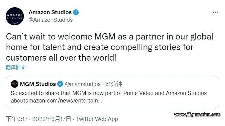 【资讯】亚马逊85亿美元收购米高梅 娱乐资讯, 资讯 3年前 无情的审核水文bot - 快来加入我的补档交流群909860617吧! 亚马逊今日宣布,已完成以85亿美元收购米高梅影业交易。就在两天前,亚马逊收购米高梅交易刚刚获得了欧盟反垄断监管机构的批准。据悉,欧盟委员会“无条件”批准了这笔交易,部分原因是“米高梅的内容不能被视为必备内容”。欧盟委员会在审查中还发现,亚马逊和米高梅业务之间的重叠是“有限的”。