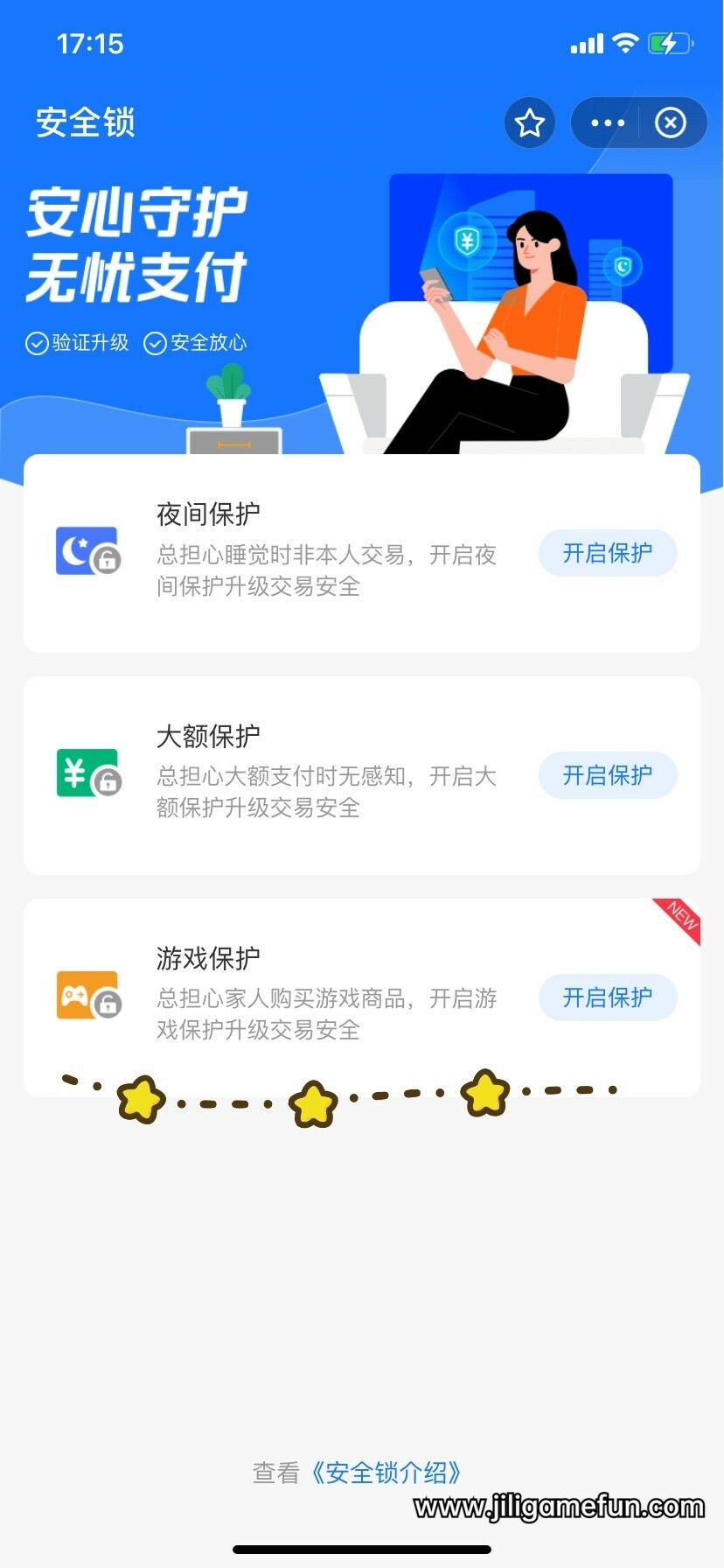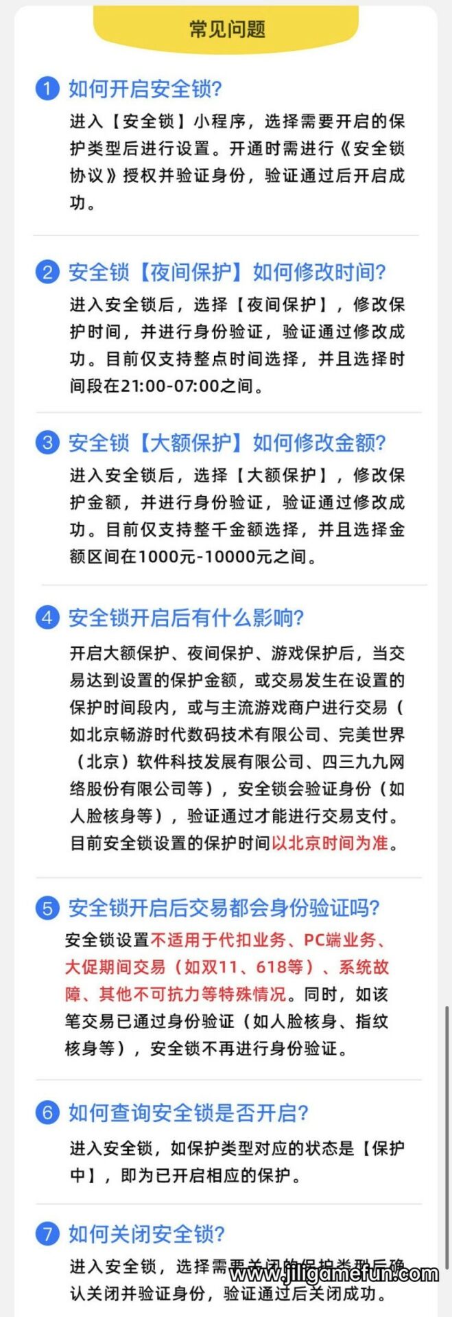 【资讯】支付宝推出“游戏锁”功能,验证通过后才能进行支付 游戏资讯, 资讯 3年前 无情的审核水文bot - 快来加入我的补档交流群909860617吧! 最后审核由 FFH T UID:73939 支付宝推出“游戏锁”功能,开启后与主流游戏商户进行交易时,安全锁会进行人脸识别,验证通过后才能进行支付。除游戏锁以外,还可设置夜间保护、大额保护。 开启步骤:我的→用户保护中心→前往安全中心→安全锁→游戏保护