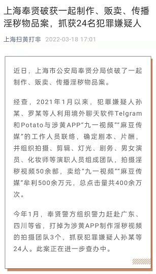 今年1月,奉贤警方组织警力赶赴广东、四川等省,打掉为涉黄APP制作淫秽视频的拍摄团队3个,抓获犯罪嫌疑人孙某等24人。此案正在进一步查办中。