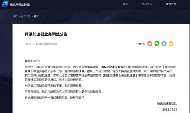 【资讯】腾讯加速器将停止外服游戏加速 游戏资讯, 资讯 3年前 无情的审核水文bot - 4 但说实话谁还没个梯子呢 腾讯网游加速器日前在官网发布公告称,因业务运营策略调整,2022 年 5 月 31 日起「腾讯网游加速器」将升级为「腾讯游戏管家」并逐步停止旧版本(即腾讯网游加速器)服务。产品升级后,将仅支持国服游戏加速。腾讯网游加速器表示,对于受影响的会员用户,其已开放退款通道。