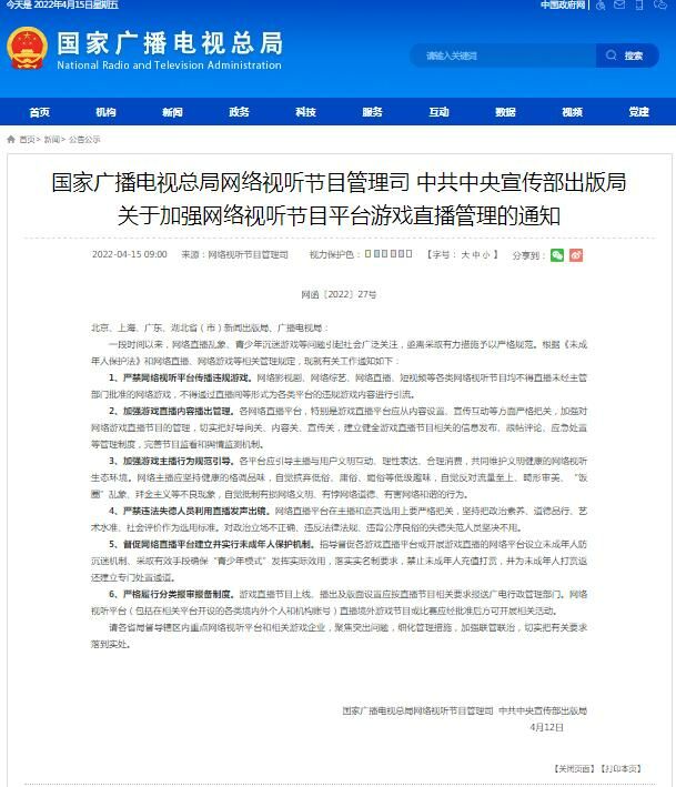 4月15日,国家广播电视总局网络视听节目管理司和中共中央宣传部出版局发布关于加强网络视听节目平台游戏直播管理的通知。其中提到,严禁网络视听平台传播违规网游。网络影视剧、网络综艺、网络直播、短视频等各类网络视听节目均不得直播未经主管部门批准的网络游戏,不得通过直播间等形式为各类平台的违规游戏内容进行引流。