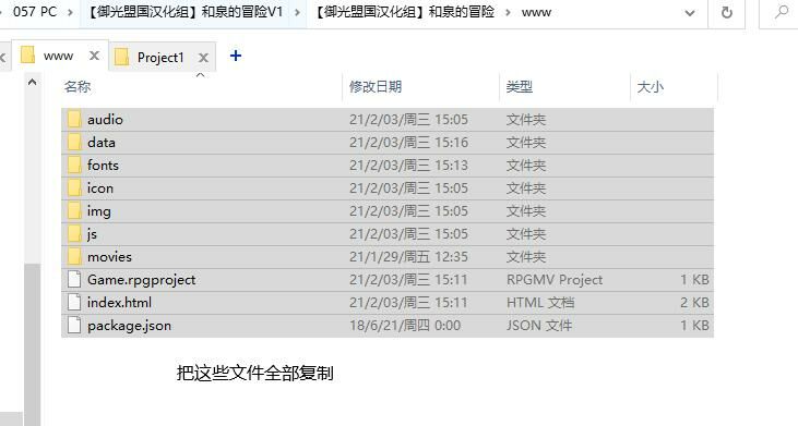 - 找到游戏根目录打开【www】文件夹,将里面的全部文件复制并粘贴到新建项目的文件夹中
