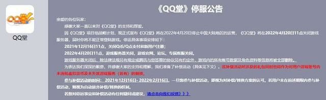 感谢大家一直以来对《QQ堂》的支持和厚爱。因《QQ堂》项目组战略计划,现正式宣布《QQ堂》将在2022年4月20日停止中国大陆地区的运营,《QQ堂》将在2022年4月20日11点关闭游戏服务器,届时你将不能正常登陆游戏。停运具体事项安排如下:2021年12月16日11点,关闭Q币/Q点支付和新用户注册;