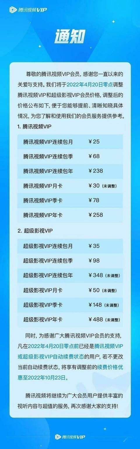 腾讯视频表示,凡在2022年4月20日零点前已经是腾讯视频VIP或超级影视VIP自动续费状态的用户,若不更改当前自动续费状态,将享有调整前的续费价格优惠至2022年10月23日。