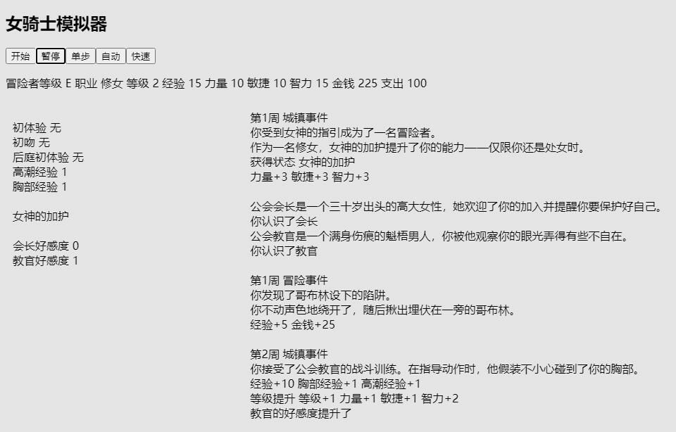 【网站推荐】女骑士模拟器(请不要用国产浏览器)【免币】 野生技术协会 3年前 zhenshi - 15 这是一款类似重开模拟器的网站,包含了丰富的h情节和各类展开。 最后审核由 龙姐 UID:1 手机端请不要用国产浏览器,可能会被屏蔽。可以用国际版的火狐。电脑可以用谷歌之类的,都没问题。起初是群友发的,感觉挺有意思就搬来了。不同分支会有不同结局,各类成就会在左边显示。 网址:https://pdfile.itch.io/princessknight 话说这个应该投在这个分类?感觉没有更适合的地方了(自言自语)