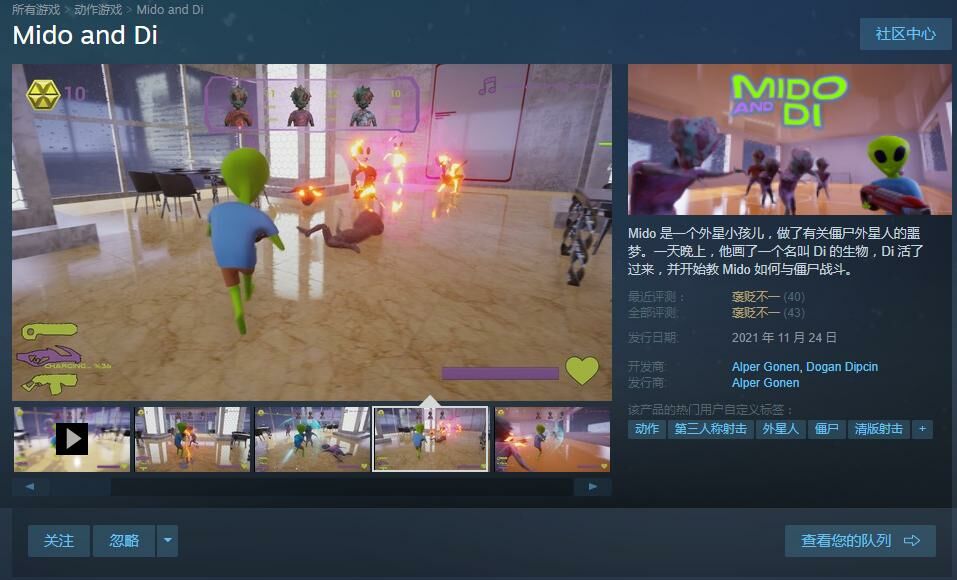 Steam目前可以免费领取第三人称射击游戏《Mido and Di》(原价26r),时间截止至5月3日,Mido 是一个外星小孩儿,做了有关僵尸外星人的噩梦。一天晚上,他画了一个名叫 Di 的生物,Di 活了过来,并开始教 Mido 如何与僵尸战斗。