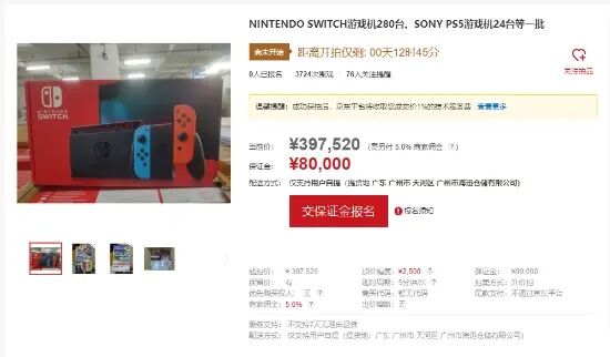 将于今天11点在京东拍卖上开拍,包含280台Switch,24台PS5,230盒Switch卡带,14套Switch卡带套装。起拍价397520元,保证金80000元,仅支持用户自提。感兴趣的朋友可以关注一下。