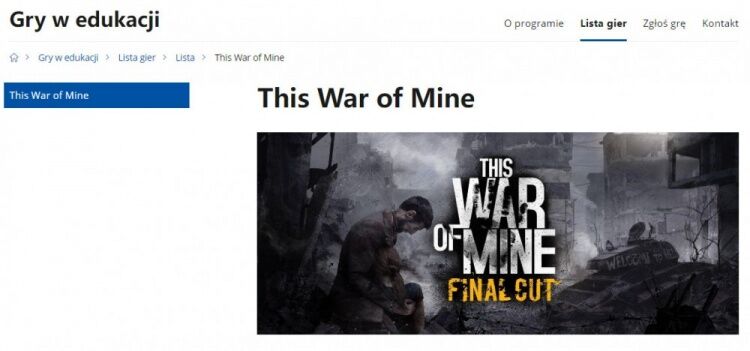 在2020年时,由波兰游戏工作室11 bit studios 打造的战争题材生存游戏《这是我的战争》得到波兰当地政府的肯定,被选为波兰教育部官方推荐的电子教材,也是波兰教育史上第一个以电子游戏为主题的补充读物。现在随着《这是我的战争 最终剪辑版》的推出,波兰政府鼓励当地高中能将《这是我的战争》纳入中学学生的教学过程中去。