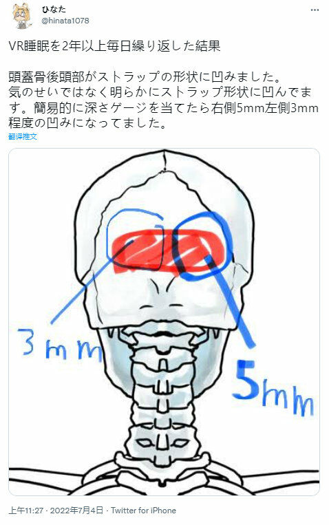 日推一位老哥因连续两年佩戴VR头显睡觉,最近发现自己头骨的后脑勺出现了一片长长的凹痕。据称其本人喜欢仰睡且不爱翻身,导致自己的头骨变形。多亏如此,他现在长时间佩戴VR设备的不适感显着减轻,被网友调侃他已经完成了“物理优化”,各位在使用游戏设备时也要注意身体健康。