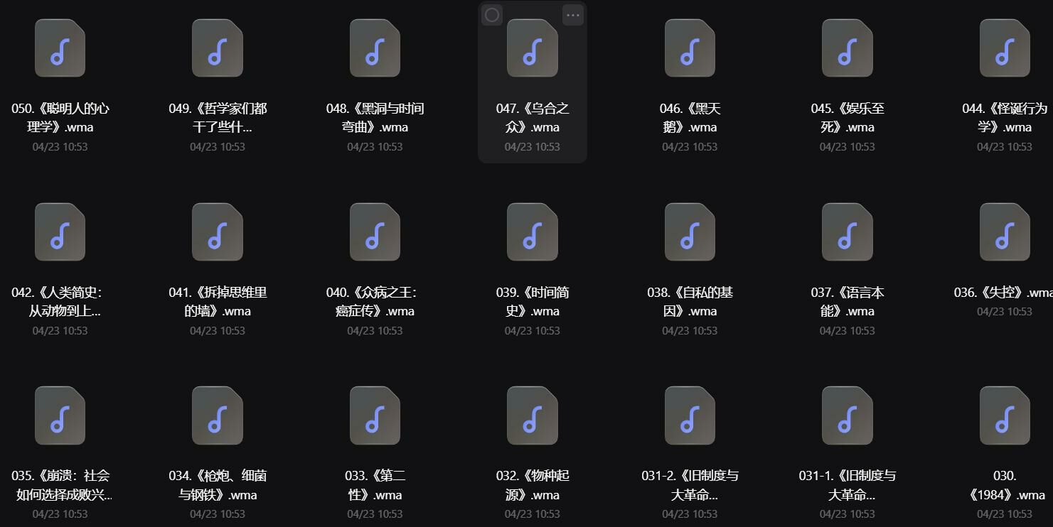 【学习资料】【课程】喜马拉雅精读全球好书(三季全) 学习资料 3年前 冬日可爱~ - 喜马拉雅精读全球好书(三季全) 最后审核由 龙姐 UID:1 喜马拉雅精读全球好书(三季全) 每一季有一百个音频,并分为两个文件夹收录。内容太多了就不一一截图发出来了,有需要的应该都懂。 PS:阿里云盘分享,无意外应该是不会失效。