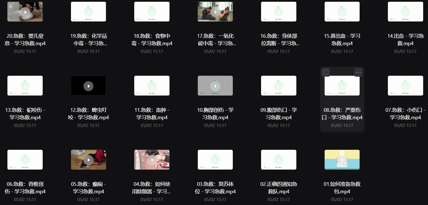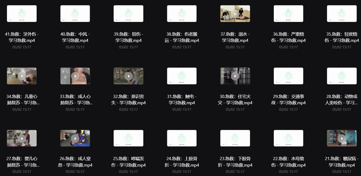 【学习资料】40多种急救技能视频教学 学习资料 3年前 冬日可爱~ - 6 40多种急救技能视频教学 最后审核由 龙姐 UID:1 40多种急救技能视频教学,包括海姆利克急救法在内的40多种急救技能 PS:阿里云盘分享,如无意外不会失效。