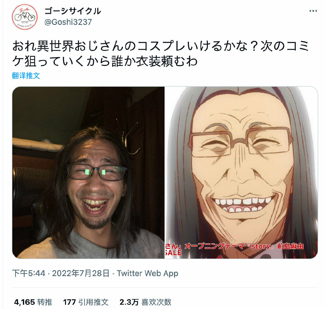推主 ゴーシサイクル 晒了自己的自拍与《异世界舅舅》的对比,并宣布要进军下一届 Comic Market。这都不用化妆了吧……