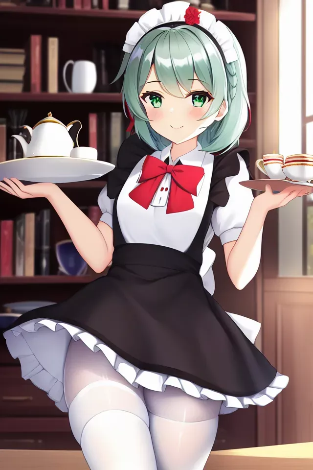 masterpiece,best qualtry,illustration, cinematic lighting, beautiful detailed eyes, 1girl, apron, ascot, black_dress, bookshelf, bow, braid, building, cake, city, cup, dress, drinking_glass, eyebrows_visible_through_hair, flower, food, green_eyes, hair_flower, hair_ornament, holding_tray, looking_at_viewer, maid, maid_apron, maid_headdress, noelle_(genshin_impact), open_mouth, pantyhose, plate, potted_plant, red_ascot, red_bow, red_ribbon, saucer, short_hair, smile, table, tea, teacup, teapot, tiered_tray, tray, waitress, white_headwear, white_legwear Negative prompt: ((((ugly)))),(((duplicate))), ((morbid)), ((mutilated)), (((tranny))), (((trans))), (((trannsexual))), (hermaphrodite), (out of frame), extra fingers, mutated hands, ((poorly drawn hands)), ((poorly drawn face)), (((mutation))), (((deformed))), ((ugly)), blurry, ((bad anatomy)), (((bad proportions))), ((extra limbs)), cloned face, (((disfigured))).(((more than 2 nipples))), out of frame, ugly, extra limbs, (bad anatomy), gross proportions, (malformed limbs), ((missing arms)),((missing legs)), (((extra arms))), (((extra legs))), mutated hands,(fused fingers), (too many fingers),(((long neck))) lowres, bad anatomy, bad hands, text, error, missing fingers, extra digit, fewer digits, cropped, worst quality,low quality, normal quality, jpeg artifacts, signature, watermark,username, blurry,text font ui,malformed hands,long neck,missing limb,Sleeveles,bad anatomy disfigured malformed mutated, (mutated hands and fingers :1.5),(long body :1.3), (mutation ,poorly drawn :1.2),bad anatomy disfigured malformed mutated,multiple breasts,bad feet,futa,yaoi Steps: 35, Sampler: Euler a, CFG scale: 7, Seed: 1887624393, Size: 640×960, Model hash: 925997e9