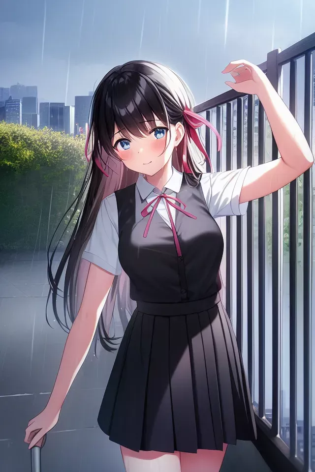 masterpiece,best qualtry,illustration, cinematic lighting, beautiful detailed eyes, 1girl, armpits, bamboo, black_hair, black_skirt, blinds, blue_skirt, blush, breasts, brick_wall, building, city, collared_shirt, day, fence, flower, frills, leaf, long_hair, looking_at_viewer, mouth_hold, neck_ribbon, outdoors, pink_ribbon, plant, potted_plant, rain, red_ribbon, ribbon, shirt, short_sleeves, skirt, sleeveless, solo, tying_hair, wet, wet_clothes, wet_shirt, white_shirt Negative prompt: ((((ugly)))),(((duplicate))), ((morbid)), ((mutilated)), (((tranny))), (((trans))), (((trannsexual))), (hermaphrodite), (out of frame), extra fingers, mutated hands, ((poorly drawn hands)), ((poorly drawn face)), (((mutation))), (((deformed))), ((ugly)), blurry, ((bad anatomy)), (((bad proportions))), ((extra limbs)), cloned face, (((disfigured))).(((more than 2 nipples))), out of frame, ugly, extra limbs, (bad anatomy), gross proportions, (malformed limbs), ((missing arms)),((missing legs)), (((extra arms))), (((extra legs))), mutated hands,(fused fingers), (too many fingers),(((long neck))) lowres, bad anatomy, bad hands, text, error, missing fingers, extra digit, fewer digits, cropped, worst quality,low quality, normal quality, jpeg artifacts, signature, watermark,username, blurry,text font ui,malformed hands,long neck,missing limb,Sleeveles,bad anatomy disfigured malformed mutated, (mutated hands and fingers :1.5),(long body :1.3), (mutation ,poorly drawn :1.2),bad anatomy disfigured malformed mutated,multiple breasts,bad feet,futa,yaoi Steps: 35, Sampler: Euler a, CFG scale: 7, Seed: 578241859, Size: 640×960, Model hash: 925997e9, Batch size: 2, Batch pos: 0