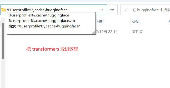 把网盘里面的 huggingface.zip 下载下来,里面有个 transformers 文件夹,把他放进 如图所示的文件夹: