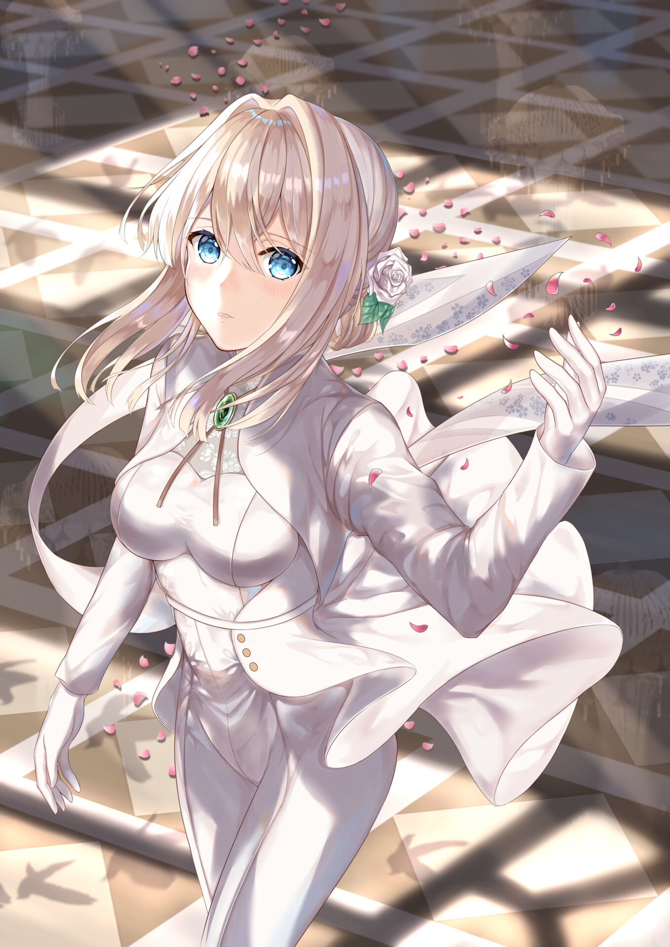 这个名为薇尔莉特·伊芙加登的少女,带给人正如人偶一般美丽又安静的感觉。金色睫毛覆着的碧蓝瞳孔如同来自海底的光辉,乳白色的肌肤上浮现出樱色的脸颊,以及涂抹得明艳而诱人的红唇。