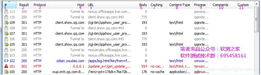 主要包含:1.请求的ID编号、2. http响应状态码、3.会话使用的协议、4.请求发送到的服务器主机名、5.数据包在服务器中的路径和文件、6.响应body的字节数。7.响应头信息Cache-Control的值、8、响应头信息Content-Type的值、9.发起请求的本地windows进程、10.注释、11.自定义备注。