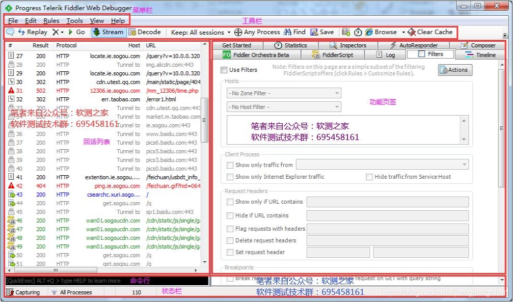 1、显示的Fiddler是否处于捕捉状态(开启/关闭状态),可以点击该区域切换。